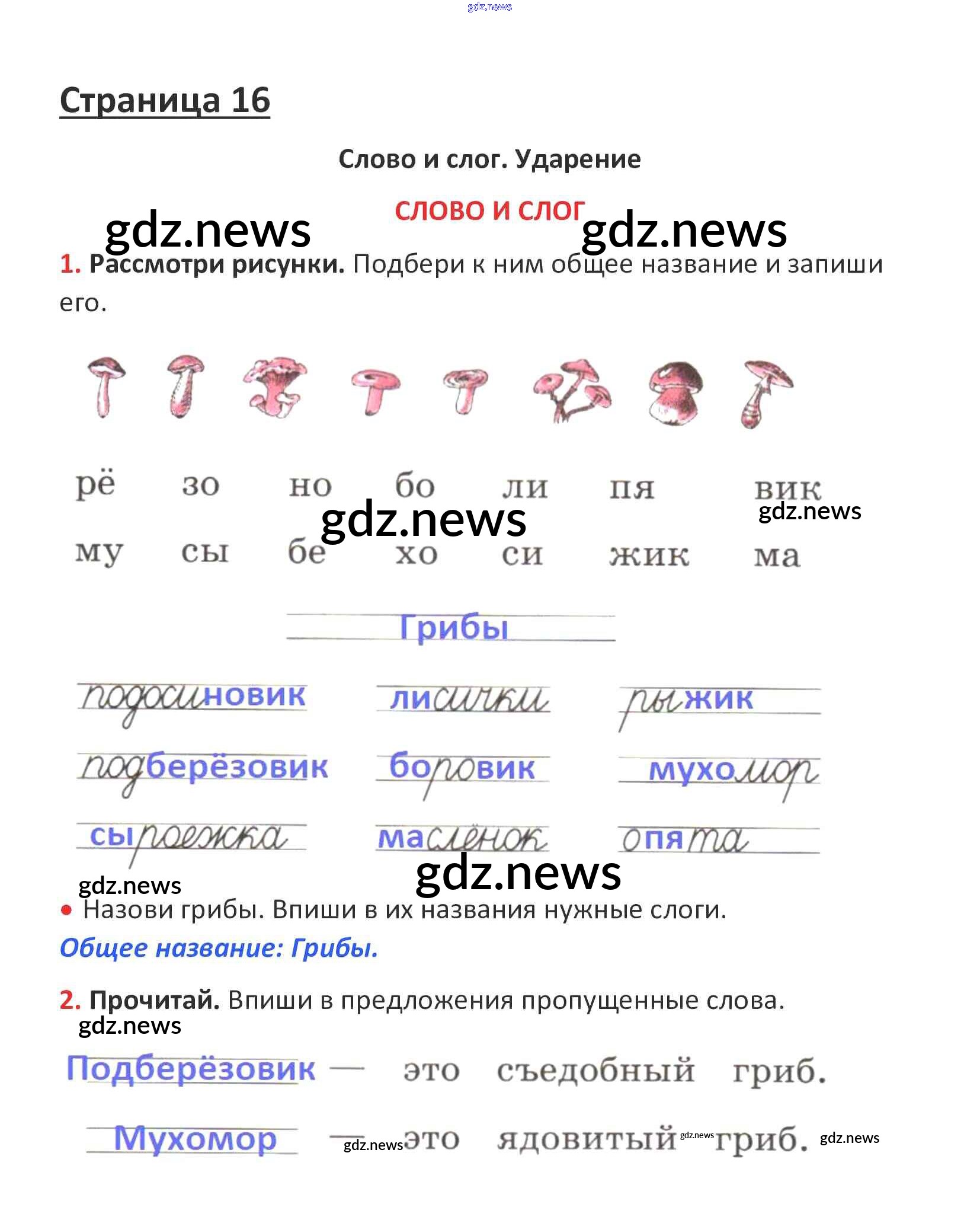 ГДЗ по Русскому языку за 1 класс Канакина, Горецкий Рабочая тетрадь Школа России - Глава 4. Слово и слог. Ударение стр. 16