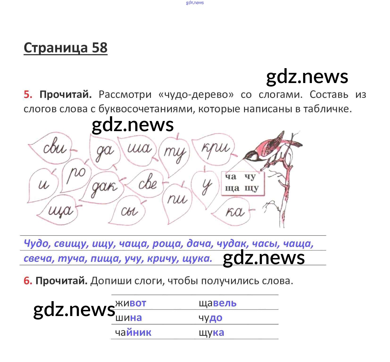 Как эффективно готовиться к домашним заданиям по Русскому языку за 1 класс: лучшие стратегии и советы на gdz.news. Здесь подготовлен Рабочая тетрадь Канакина, Горецкий Школа России - Глава 5. Звуки и буквы стр. 58 и готовые ответы к ним. Сверяй домашку и получай отличные оценки!