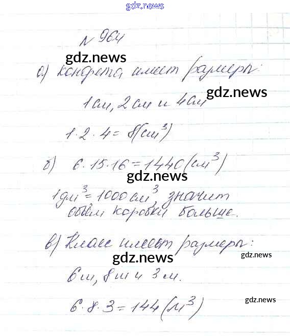 Как эффективно готовиться к домашним заданиям по Математике за 5 класс: лучшие стратегии и советы на gdz.news. Здесь подготовлен Учебник Дорофеев, Шарыгин, Суворова, Бунимович, Кузнецова, Минаева, Рослова - 10.3. Объем параллелепипеда 964 и готовые ответы к ним. Сверяй домашку и получай отличные оценки!