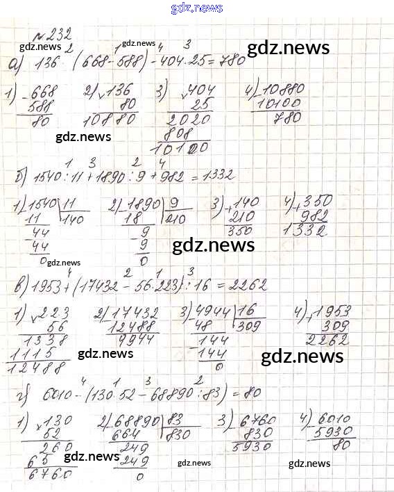Как эффективно готовиться к домашним заданиям по Математике за 5 класс: лучшие стратегии и советы на gdz.news. Здесь подготовлен Учебник Дорофеев, Шарыгин, Суворова, Бунимович, Кузнецова, Минаева, Рослова - 3.3. Порядок действий в вычислениях 232 и готовые ответы к ним. Сверяй домашку и получай отличные оценки!