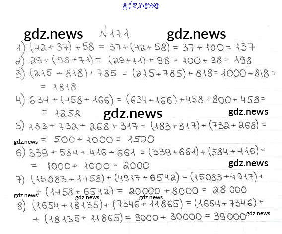 Как эффективно готовиться к домашним заданиям по Математике за 5 класс: лучшие стратегии и советы на gdz.news. Здесь подготовлен Учебник Мерзляк, Полонский, Якир Алгоритм успеха - § 7. Сложение натуральных чисел. Свойства сложения 171 и готовые ответы к ним. Сверяй домашку и получай отличные оценки!