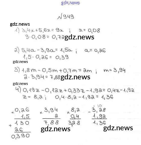 Как эффективно готовиться к домашним заданиям по Математике за 5 класс: лучшие стратегии и советы на gdz.news. Здесь подготовлен Учебник Мерзляк, Полонский, Якир Алгоритм успеха - §34. Умножение десятичных дробей 949 и готовые ответы к ним. Сверяй домашку и получай отличные оценки!