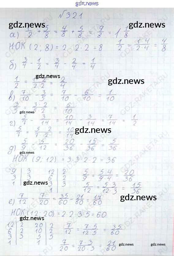Как эффективно готовиться к домашним заданиям по Математике за 6 класс: лучшие стратегии и советы на gdz.news. Здесь подготовлен Учебник Виленкин, Жохов, Чесноков, Шварцбурд - §2. Сложение и вычитание дробей с разными знаменателями 321 и готовые ответы к ним. Сверяй домашку и получай отличные оценки!