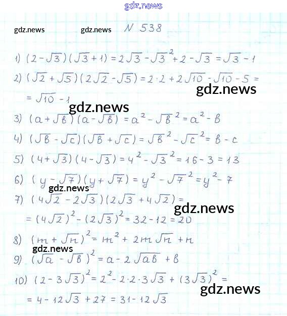 Как эффективно готовиться к домашним заданиям по Алгебре за 8 класс: лучшие стратегии и советы на gdz.news. Здесь подготовлен Учебник Мерзляк, Полонский, Якир Алгоритм успеха - §17. Тождественные преобразования выражений, содержащих арифметические квадратные корни 538 и готовые ответы к ним. Сверяй домашку и получай отличные оценки!