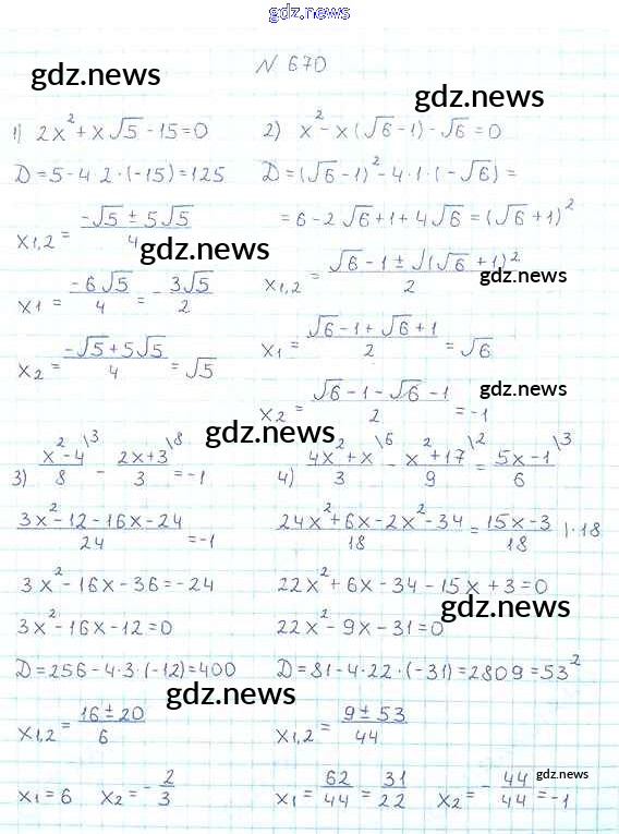 Как эффективно готовиться к домашним заданиям по Алгебре за 8 класс: лучшие стратегии и советы на gdz.news. Здесь подготовлен Учебник Мерзляк, Полонский, Якир Алгоритм успеха - §20. Формула корней квадратного уравнения 670 и готовые ответы к ним. Сверяй домашку и получай отличные оценки!