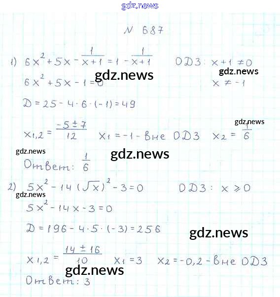 Как эффективно готовиться к домашним заданиям по Алгебре за 8 класс: лучшие стратегии и советы на gdz.news. Здесь подготовлен Учебник Мерзляк, Полонский, Якир Алгоритм успеха - §20. Формула корней квадратного уравнения 687 и готовые ответы к ним. Сверяй домашку и получай отличные оценки!