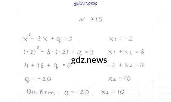 Как эффективно готовиться к домашним заданиям по Алгебре за 8 класс: лучшие стратегии и советы на gdz.news. Здесь подготовлен Учебник Мерзляк, Полонский, Якир Алгоритм успеха - §21. Теорема Виета 715 и готовые ответы к ним. Сверяй домашку и получай отличные оценки!
