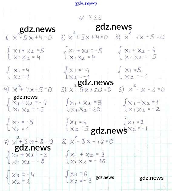 Как эффективно готовиться к домашним заданиям по Алгебре за 8 класс: лучшие стратегии и советы на gdz.news. Здесь подготовлен Учебник Мерзляк, Полонский, Якир Алгоритм успеха - §21. Теорема Виета 722 и готовые ответы к ним. Сверяй домашку и получай отличные оценки!